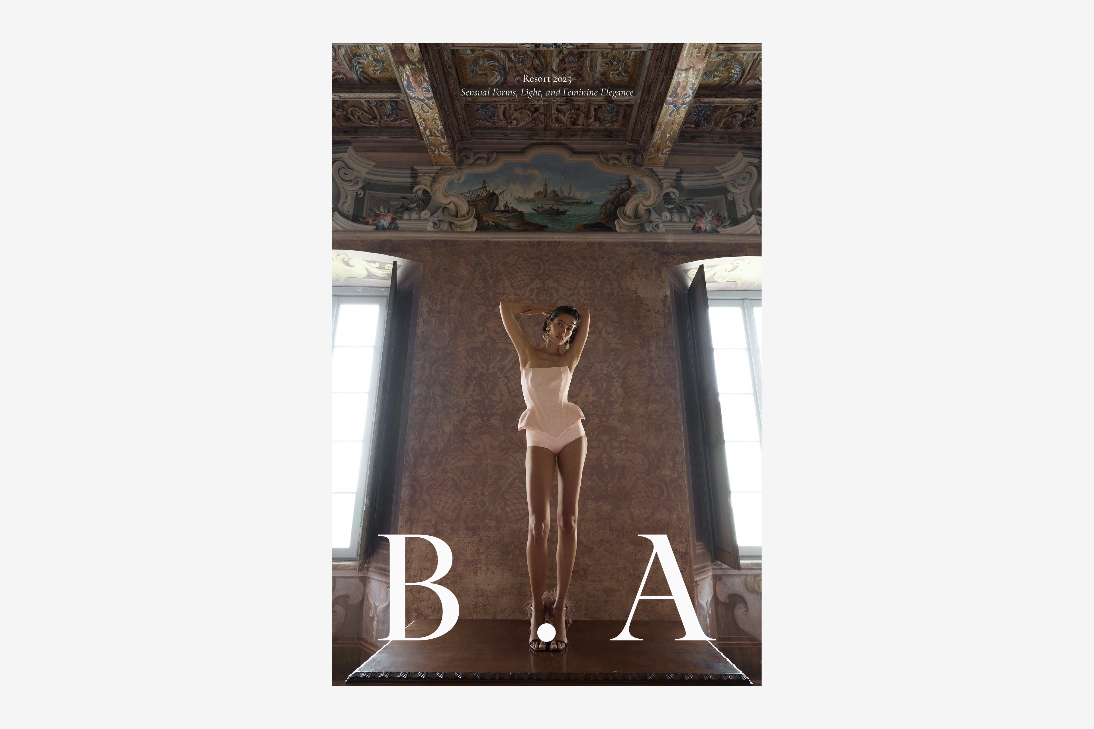 At larger scales, the B · A mark visually opens up space at the center of the composition, creating the impression that the letters step aside to make room for the image. The central dot acts as an anchoring element, holding the abbreviation together as a unified whole and maintaining visual balance. This effect of scale allows the mark to support the image rather than compete with it, working as a frame and visual foundation for the model.